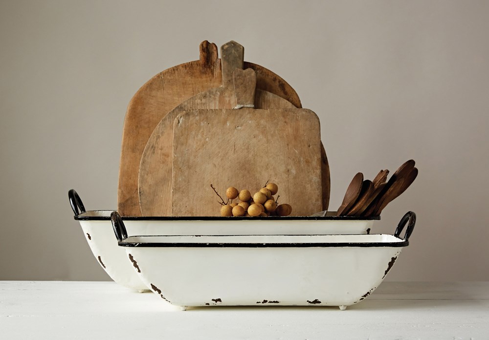 Bandejas esmaltadas, puedes servir pan, pero también usarlas de frutero o como organizador para el baño. Nuestras bandejas esmaltadas quedarán bien en cualquier lugar de tu casa.