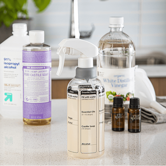 Prepara tus propios implementos de limpieza en base a ingredientes no tóxicos. Cuida a tu familia y al medio ambiente usando las recetas que trae esta botella con spray o úsala con las medidas que trae con tus propias recetas. Seguro que querrás tener más de una.