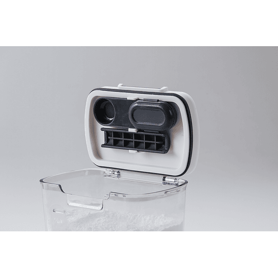 La cuchara para empolvorar y el nivelador extraíbles se encajan dentro de la tapa para su almacenamiento.