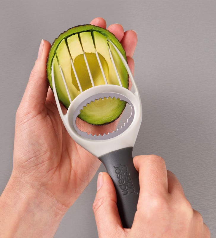 El Cuchillo para Paltas Duo de Joseph Joseph tiene 3 funciones en 1 que te permiten preparar paltas con un solo utensilio. Tiene un cuchillo retráctil para cortar la cáscara, un rebanador para el interior y un descarozador para el cuesco. Material: Acero inoxidable y polipropileno relleno de fibra de vidrio.