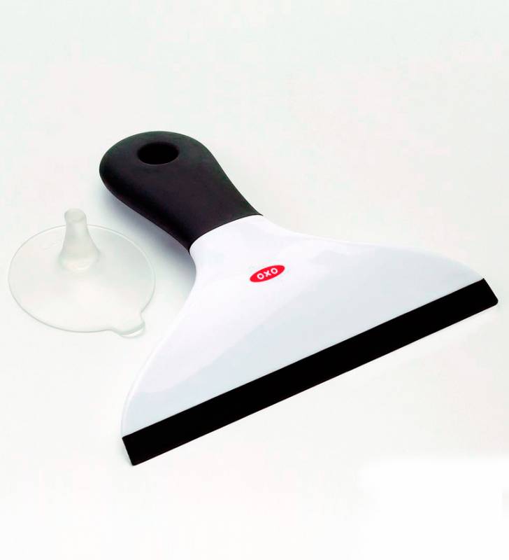 Escobilla de goma para limpiar vidrios y espejos. Con una hoja flexible apta para cualquier tipo de superficie, lisa o curva. De mango cómodo y antideslizante, incluye una ventosa para colgarlo en la pared.