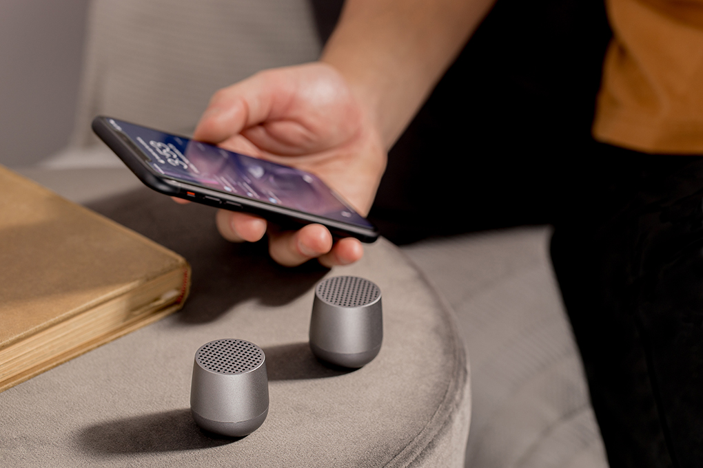 Mino + está disponible en versión individual o doble. Este dúo de altavoces interconectables que cabe en tu bolsillo ofrece un sonido estéreo que amplificará tu experiencia auditiva.